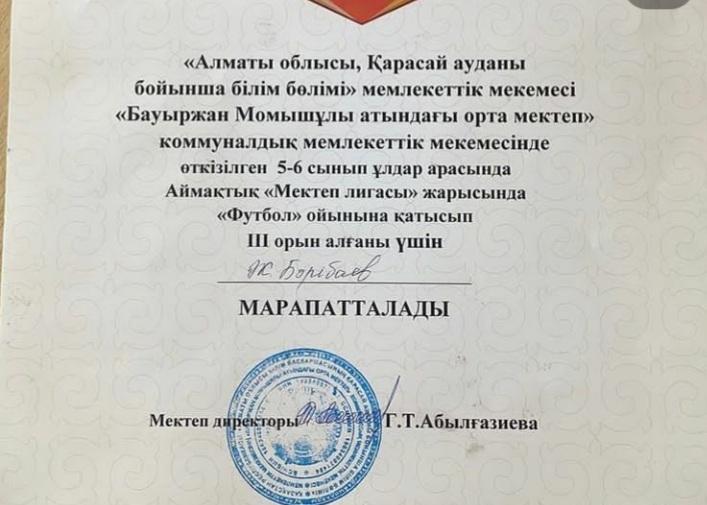 2022 жылғы 20 қыркүйек күні «Алматы облысы, Қарасай ауданы бойынша білім бөлімі» мемлекеттік мекемесі «Бауыржан Момышұлы атындағы орта мектеп» коммуналдык мемлекеттік мекемесінде ұлдар арасында Аймақтық «Мектеп лигасы» футбол жарысы етті. Жарысқа мектебіміздің намысын қорғауға 5-6 сынып оқушылары қатысып, жүлделі III орынды иеленді. Жетекшілік еткен дене шынықтыру пәнінің мұғалімдері Б. Топашов және Р.Үсенов. Жеңістеріңіз құтты болсын!!!