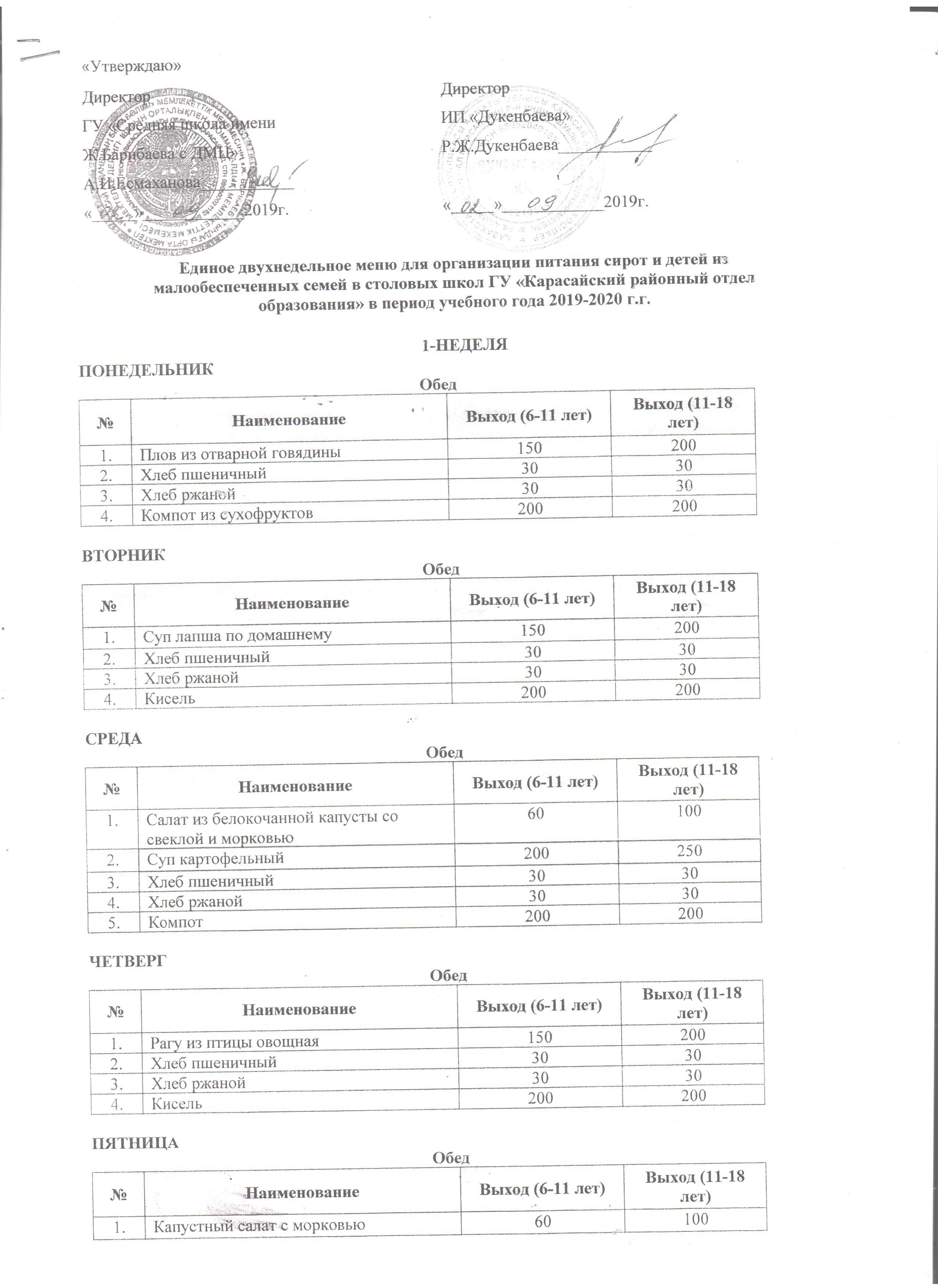 19 ноябрь 2020 0 1 2 3 4 5 Мектеп асханасының мәзірі 2019-2020 оқу жылының жетім, аз қамтылған, көпбалалы, жартылай жетім оқушылардың ыстық тамақ бойынша 2 апталық тегін ас-мәзірі.